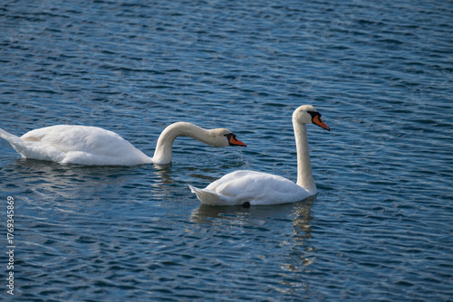 Obraz premium Two elegant white swans glide side by side across calm rippling water under a...