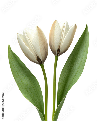 © Faisal, Fototapeta premium Two Elegant White Tulips with Green Leaves, Isolated on Transparent and White Background