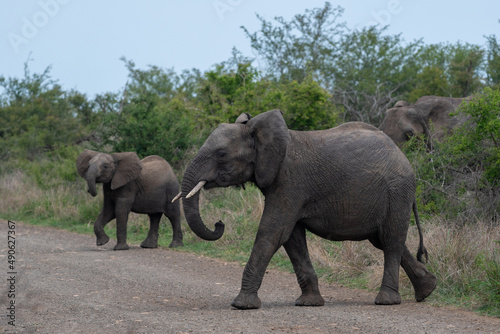 Obraz premium two elephants crossing the road