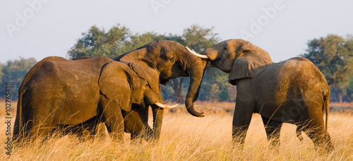 © gudkovandrey, Obraz premium Two elephants playing with each other. Zambia. Lower Zambezi National Park. Zambezi River. An excellent illustration.