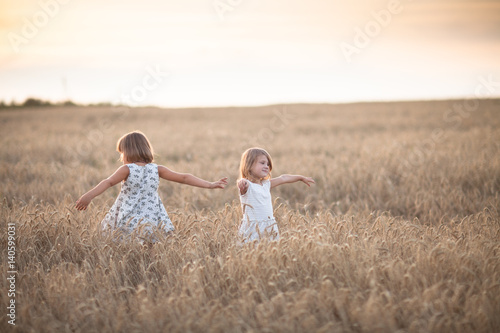 © natalialeb, Naklejka premium Two emotional sisters girls dance at sunset