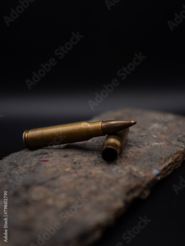 Obraz premium Two empty cases of 7.62mm rounds on a rock