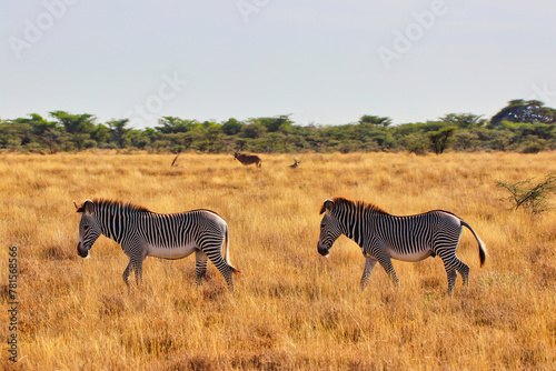 © InnerPeace, Fototapeta premium Two endangered Grevy's Zebras on the lookout for fresh grass in the dry savanna plains with a Beisa Oryx for company in the vast Buffalo Springs Reserve in Samburu County, Kenya