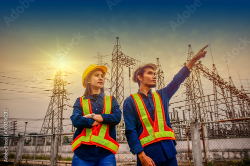 © Suriyo, Fototapeta premium Two Engineer Standing at Work place Power plant Electric Factory plan System Sky Background
