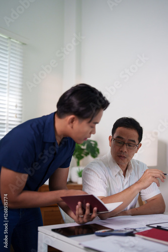 © Pichsakul, Obraz premium Two engineers analyzing a construction project's blueprint and taking notes on material usage.