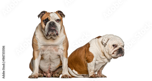 Obraz premium Two english bulldogs sitting portrait on white background