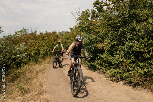 © arthurhidden, Obraz premium Two enthusiastic bikers riding on a dirt trail surrounded by lush green trees
