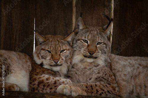 © Dead Tree World, Obraz premium two Eurasian lynxes laying together,