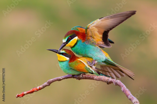 Obraz premium Two european bee-eaters, merops apiaster, mating on a twig in spring nature....