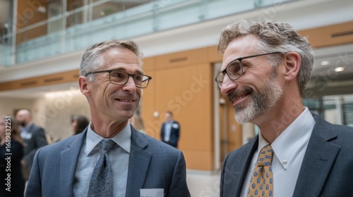 Obraz premium Two executives in formal attire share insights on leadership and business development inside a bright and modern office environment.