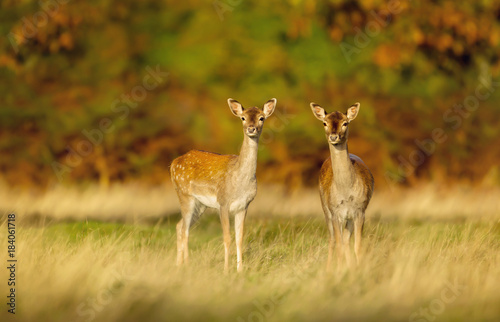 Obraz premium Two fallow deer does in the field of grass against colourful autumnal background, UK. Animals in autumn.