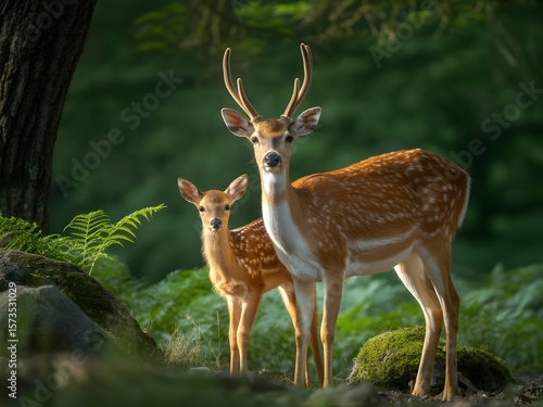 © Mojaher, Naklejka premium Two fallow deer standing together in a lush green forest setting