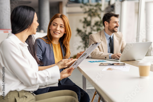 Fototapeta premium Two female experts sitting on a meeting at boardroom and discussing paperwork...