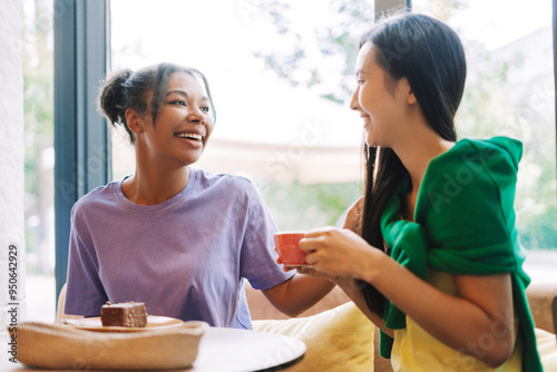 © Maria Vitkovska, Fototapeta premium Two female friends sharing a moment together at local coffee shop