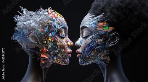 Naklejka premium Two female profiles, abstract tech patterns, glowing elements, digital...
