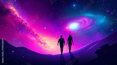 Fototapeta premium Two figures explore a vibrant cosmic landscape.