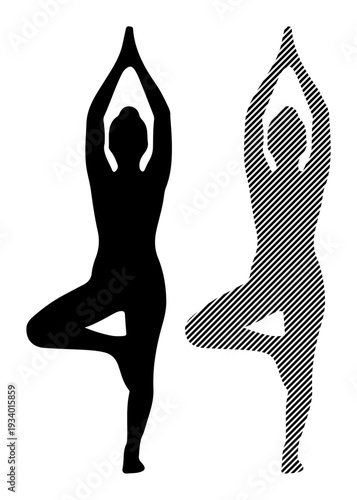 Fototapeta premium Two figures practicing tree pose, one solid silhouette and one with diagonal lines, symbolizing balance and yoga.