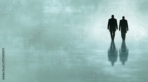 Fototapeta premium Two figures walking on a still surface.