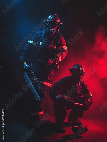 © ulum, Fototapeta premium Two firefighters in full protective gear posing confidently, one holding a chainsaw and the other a large hammer, illuminated by dramatic red and blue studio lighting.