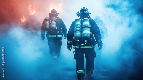 © Almahyra, Naklejka premium Two firefighters walking into smoky fire scene.