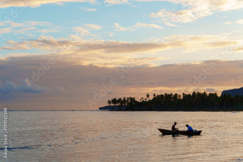 Fototapeta premium two fishermen in a boat going fishing early in the morning at dawn