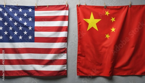 © Maryna, Fototapeta premium Two flags, USA, China, suspended on gray concrete wall. American flag, stars, stripes, on left, Chinese flag, red, yellow star, on right. Dynamic contrast between flags colors, gray background.