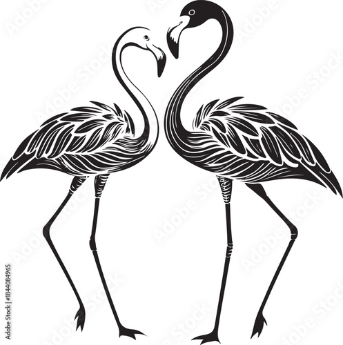 © Tonix Pix, Fototapeta premium Two Flamingo Birds Standing Together Love Couple St. Valentine's Hand-drawn Sketch Drawing Vector Illustration, Line Linear Symbol Engraving Coloring Book, Black and White Isolated