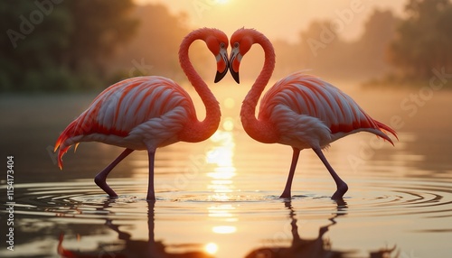Fototapeta premium Two flamingos forming heart shape with their necks at sunset in calm water