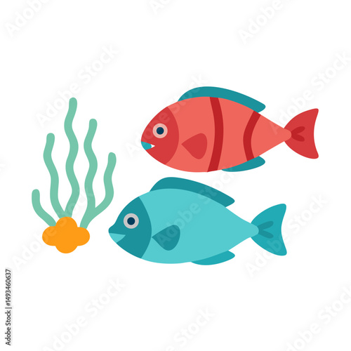 © Sharuzzaman, Fototapeta premium Two flat design fishes with seaweed on black background