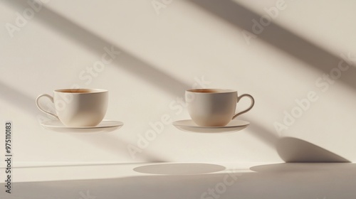 © cac_tus, Obraz premium Two floating tea cups with shadows on beige background, minimalist art concept