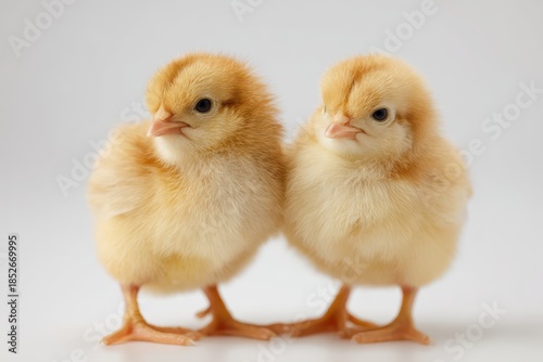 © Mykola, Fototapeta premium Two fluffy baby chicks on a pristine white background with soft studio lighting