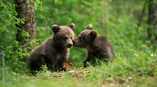 Fototapeta premium Two fluffy brown bear cubs nuzzling in a lush green forest brown bears