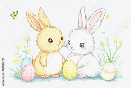 © Laima Gri, Obraz premium Two fluffy bunnies, one yellow and one white, sit side by side amidst pastel Easter eggs and spring flowers.