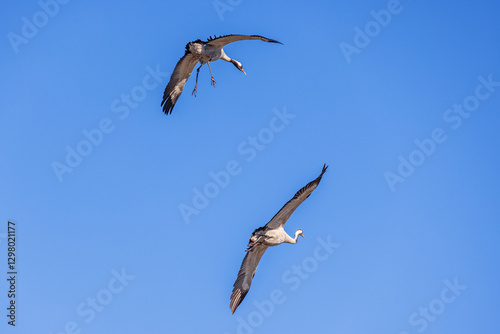 © Lars Johansson, Fototapeta premium Two flying cranes at a blue sky