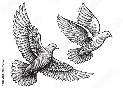 Obraz premium two flying doves engraving vector illustration