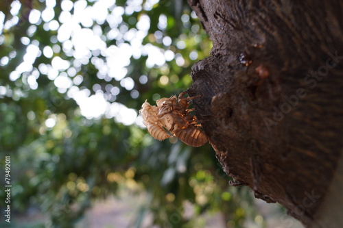 © ggvisuals, Fototapeta premium Two fossilized cicadas on the trunk of a tree.