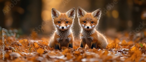 © Creative_Bringer, Fototapeta premium Two fox cubs in an autumn setting, warm tones, cute and endearing