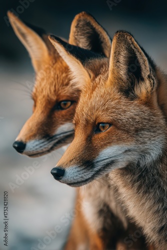© Maksym, Fototapeta premium Two foxes gaze thoughtfully at the serene landscape at dusk