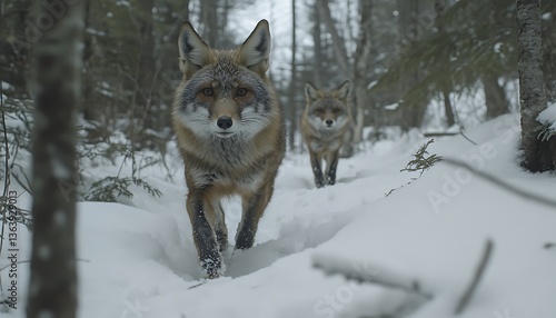 Fototapeta premium Two foxes in snowy forest