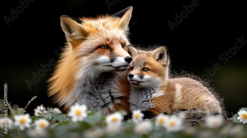 © Wall, Fototapeta premium Two foxes seated side by side on a green grass field adorned with white blooms, against a backdrop of pure black