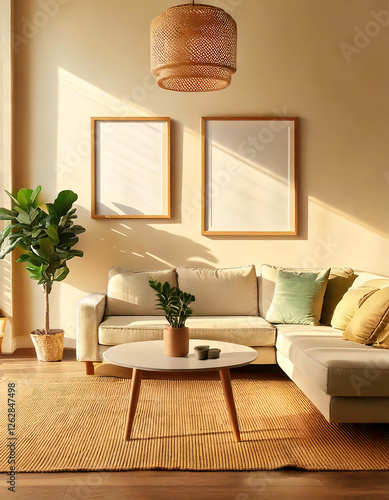 © Photo Manager, Fototapeta premium two frames wall art mockup modern living room with fireplace