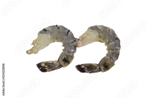 Obraz premium Two Fresh Black Tiger Shrimps Peeled with Tail Shells on White Background –...