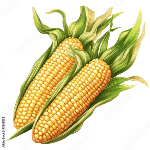 Obraz premium Two fresh corn cobs display vibrant yellow kernels and lush green husks, showcasing their agricultural charm, corn cobsillustration on transparent background