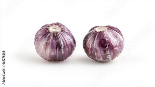 © AI_Vision, Obraz premium Two Fresh Garlic Cloves on a Clean White Background with Soft Studio Lighting for Product Photos