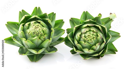 Obraz premium Two fresh green artichokes that have layered leaves and thick stems are isolated on a white background, showcasing a creation from Generative AI. The artichokes' unique structure and vibrant green