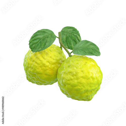© PixelGen, Fototapeta premium Two Fresh Kaffir Limes on Branch with Leaves Isolated on white background