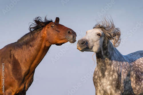 © callipso88, Obraz premium Two funny horse portrait against sky background