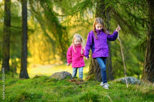 Fototapeta premium Two funny little sisters having fun during forest hike on beautiful autumn day