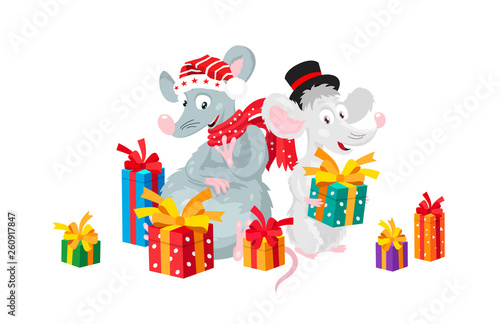 Naklejka premium Two funny rats surrounded by gift boxes.