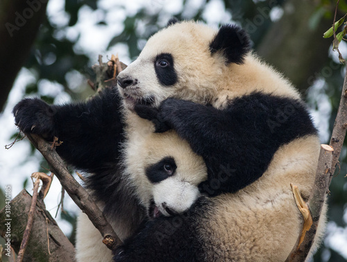 © JAK, Obraz premium Two giant pandas, Ailuropoda melanoleuca, approximately 6-8 months old, playing in a tree.